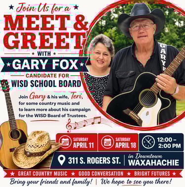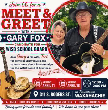 Come out and meet Gary Fox, candidate for the WISD School Board, and learn more about his vision for our schools and community.